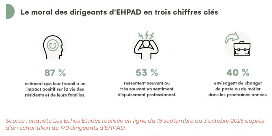 Les Echos Etudes publient le 20 janvier les résultats d'une enquête réalisée en ligne du 18 septembre au 3 octobre 2025 auprès d'un échantillon de 170 dirigeants d'Ehpad pour mieux comprendre leur perception du métier, les réalités de leur quotidien et leurs attentes pour l'avenir. La première édition de ce Baromètre, appelé à se renouveler, a visé à établir un état des lieux objectif du moral des dirigeants d'Ehpad et à en suivre l'évolution dans la durée, autour de quatre grands thèmes :